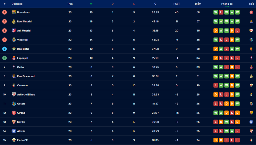 Bảng xếp hạng truyền thống là bản tổng kết. Nhưng bảng xếp hạng live mới là nơi thể hiện trọn vẹn tính cạnh tranh của giải đấu. Ở một môi trường khốc liệt như La Liga, nơi khoảng cách điểm số thường rất sít sao, thứ hạng có thể đổi chỗ chỉ trong vài phút.